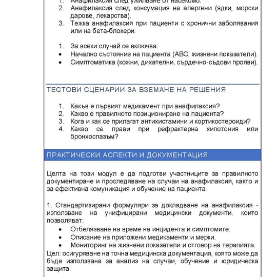 „Въведение в анафилаксията“ е практическо ръководство за медицински специалисти и екипи за спешна помощ, посветено на разпознаването и овладяването на животозастрашаващи алергични реакции. Книгата представя патофизиологията на анафилаксията, най-честите отключващи фактори, ранните предупредителни симптоми и диагностичните критерии, както и стъпкови протоколи за лечение, включително приложение на адреналин, поддръжка на дихателни пътища и последваща наблюдение и грижа. С ясни алгоритми, педиатрични особености и реални клинични сценарии, това ръководство предоставя знания и увереност за бързо разпознаване и ефективно животоспасяващо поведение при анафилаксия в доболнични и болнични условия.