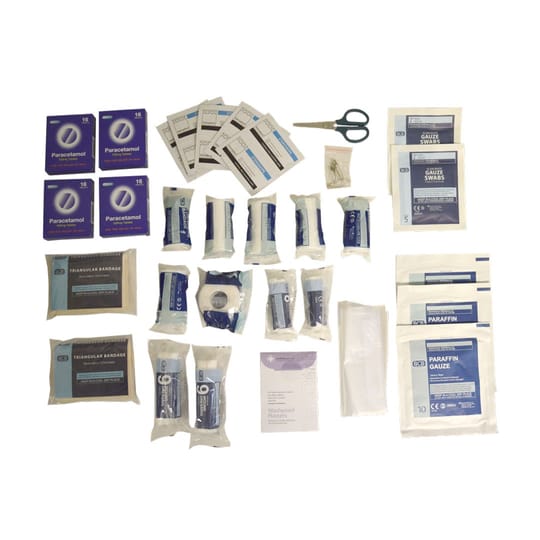 Contents include: Burn bags, paratulle, survival instructions, bandages, 5”scissors, antiseptic wipes, safety pins, plasters, triangular bandages, paracetamol, compressed bandages, elastic adhesive bandages, sterile gauze swabs.
