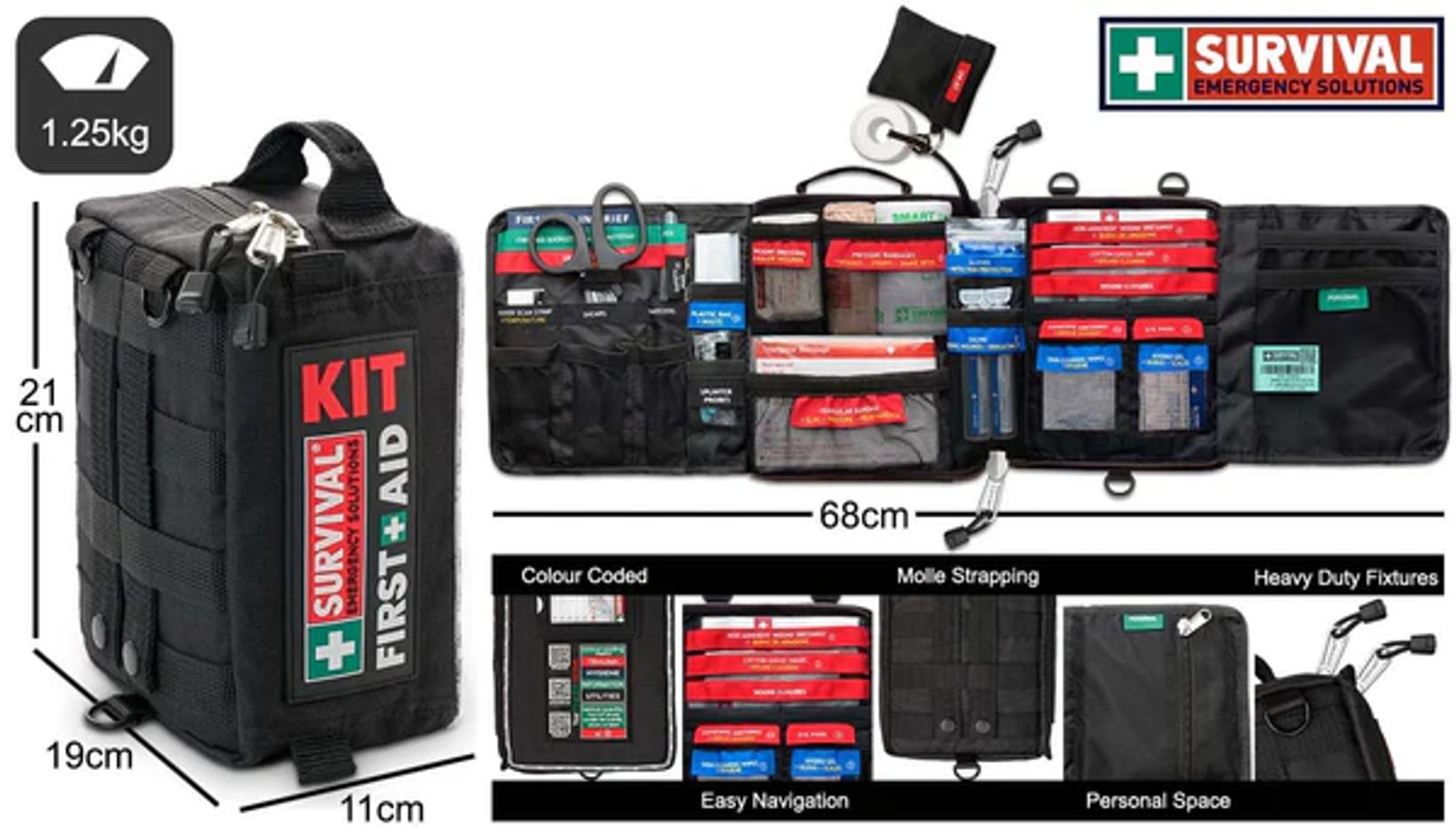 Description The SURVIVAL Vehicle First Aid KIT has been designed with weight and space in mind, without compromising any of the items on your motorist first aid checklist.